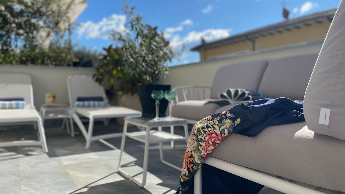 La grande terrazza che collega la cucina alla zona notte è dotata di tende da sole e arredo outdoor.